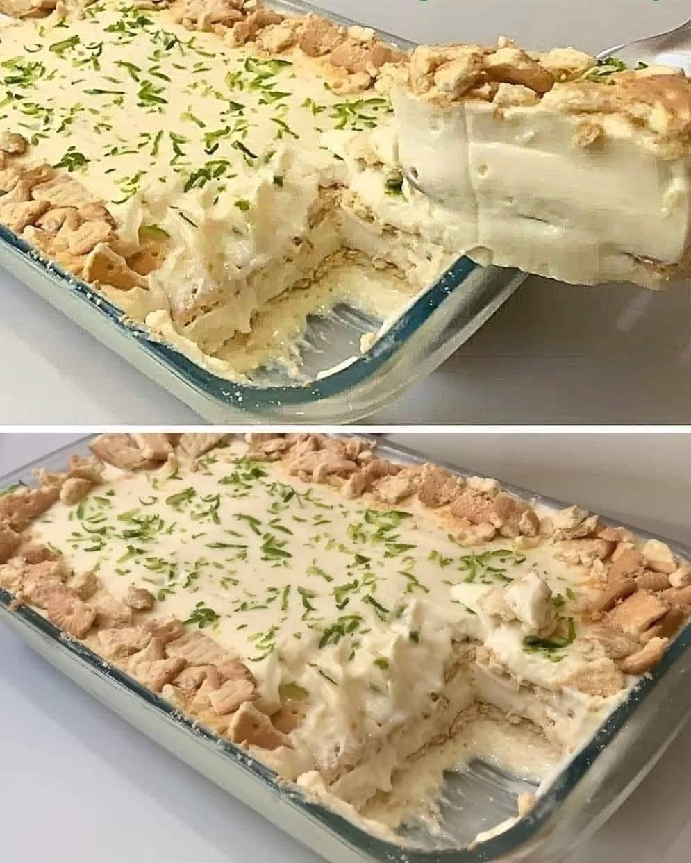 Ingredients: 50 ml of lemon juice 2 containers of heavy cream 2 containers of sweetened condensed milk 1 package of cookie dough or biscuits 1 tablespoon of lemon zest and some crushed macaroons (optional, for topping) Preparation: see continuation on next page