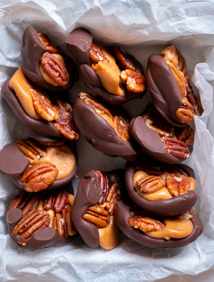 Ingredients 2 cups pecan halves 3 tablespoons butter, melted 2 teaspoons salt 1 ¾ cups semi sweet chocolate, melted Caramel ¼ cup water 1 cup dark brown sugar 1 cup sweetened condensed milk ⅔ cup corn syrup 7 tablespoons butter 1 teaspoon vanilla ½ teaspoon salt Preparation see continuation on next page … Read more