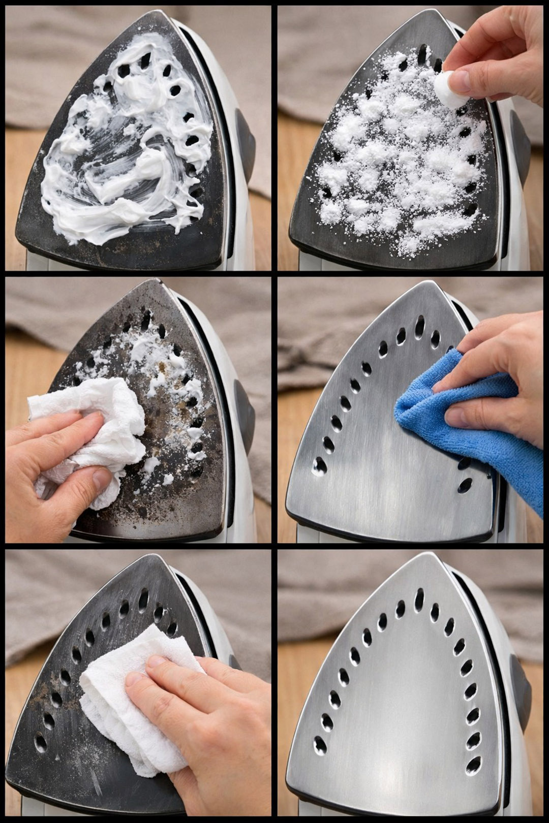 Start by unplugging your iron and letting it cool completely. Place it with the soleplate facing up, then apply a thin layer of toothpaste over the entire surface. Lightly sprinkle baking soda to cover the blackened areas. Let it sit for 5 to 10 minutes so the mixture can do its job. Gently wipe with a soft cloth or paper towel—the marks disappear almost like magic. Finish with a damp cloth, then dry carefully. Your iron regains a clean soleplate and glides like it did on the first day, for perfect ironing.