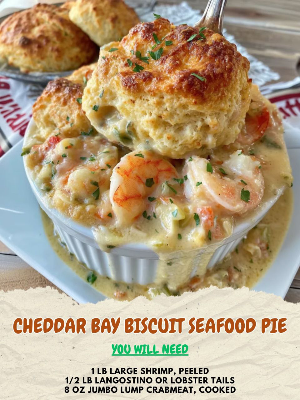 Creamy seafood filling topped with savory cheddar biscuits – comforting and crowd-pleasing.