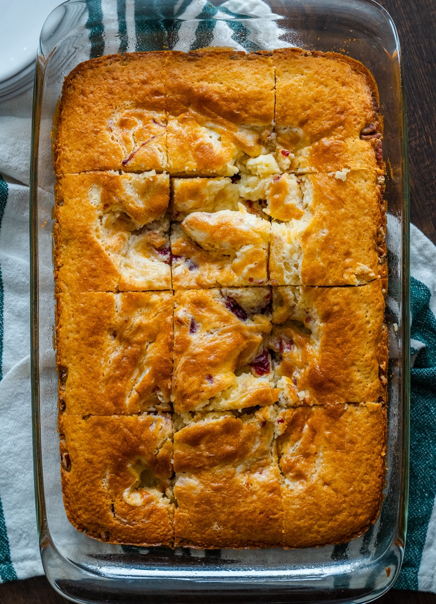 If you’re looking for a holiday dessert that captures the flavor and the craziness of the season, this Christmas Chaos Cake is just the thing. This recipe takes a classic cake mix and transforms it into something truly show-stopping, thanks to swirls of cranberry sauce and pockets of sweet cream cheese baked right in. Inspired by the classic Earthquake Cake, it cracks and swirls as it bakes for an imperfect look that’s part of its charm! And there’s no frosting required for this sweet treat, one less thing to worry about in the Christmas rush.