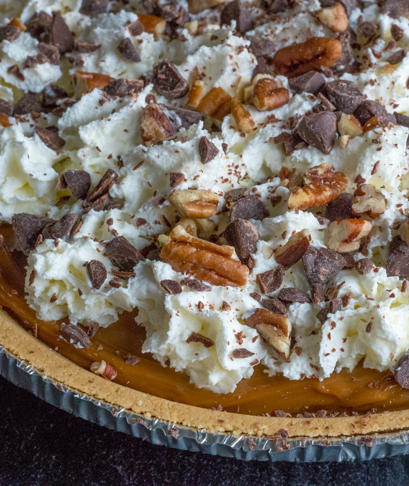 There’s nothing a like a cold dessert during the warmer months. And, this one is a real doozie. Modeled after the caramel pie served at O’Charley’s restaurants, this pie is served cold and features the flavors of caramel, whipped cream, pecans, garnished with bits of chocolate on top. It’s a sweet tooth’s dream, but even people who don’t always love sweet things seem to really enjoy this dessert.