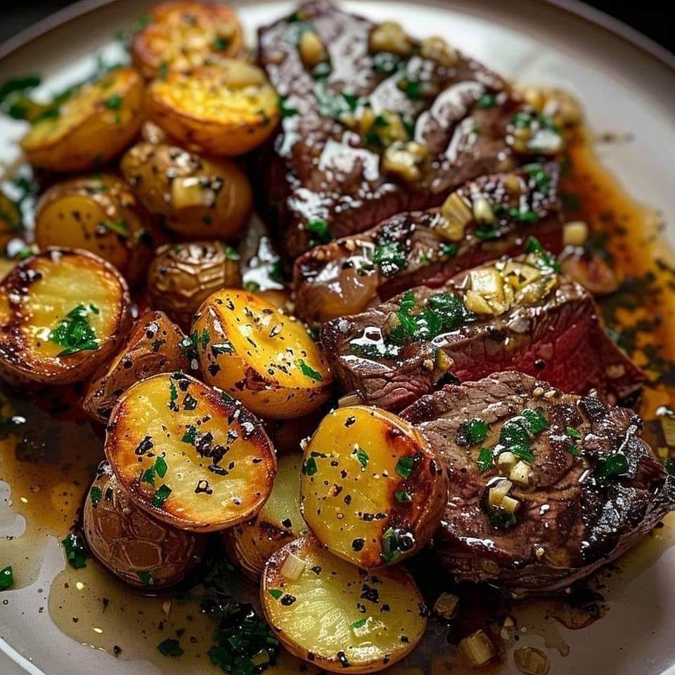 Garlic Butter Steak Recipe with Potatoes Skillet – This easy one-pan steak and potatoes recipe is SO simple and SO flavorful. Juicy steak, seared to perfection, is cooked with crisp golden potatoes and a luscious garlic, herbs, and butter sauce. The thing we love with flank is that it’s a lean, yet soft cut of beef, meaning this seared steak recipe is nearly impossible to mess up. Ready in 30 minutes or less, this is the best steak and potatoes you’ll ever have!