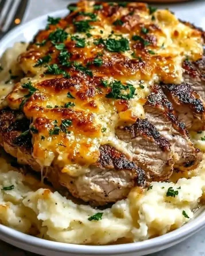A decadent, protein-packed meal with tender chicken and steak nestled atop creamy, cheesy mashed potatoes—perfect for a family dinner or special treat!