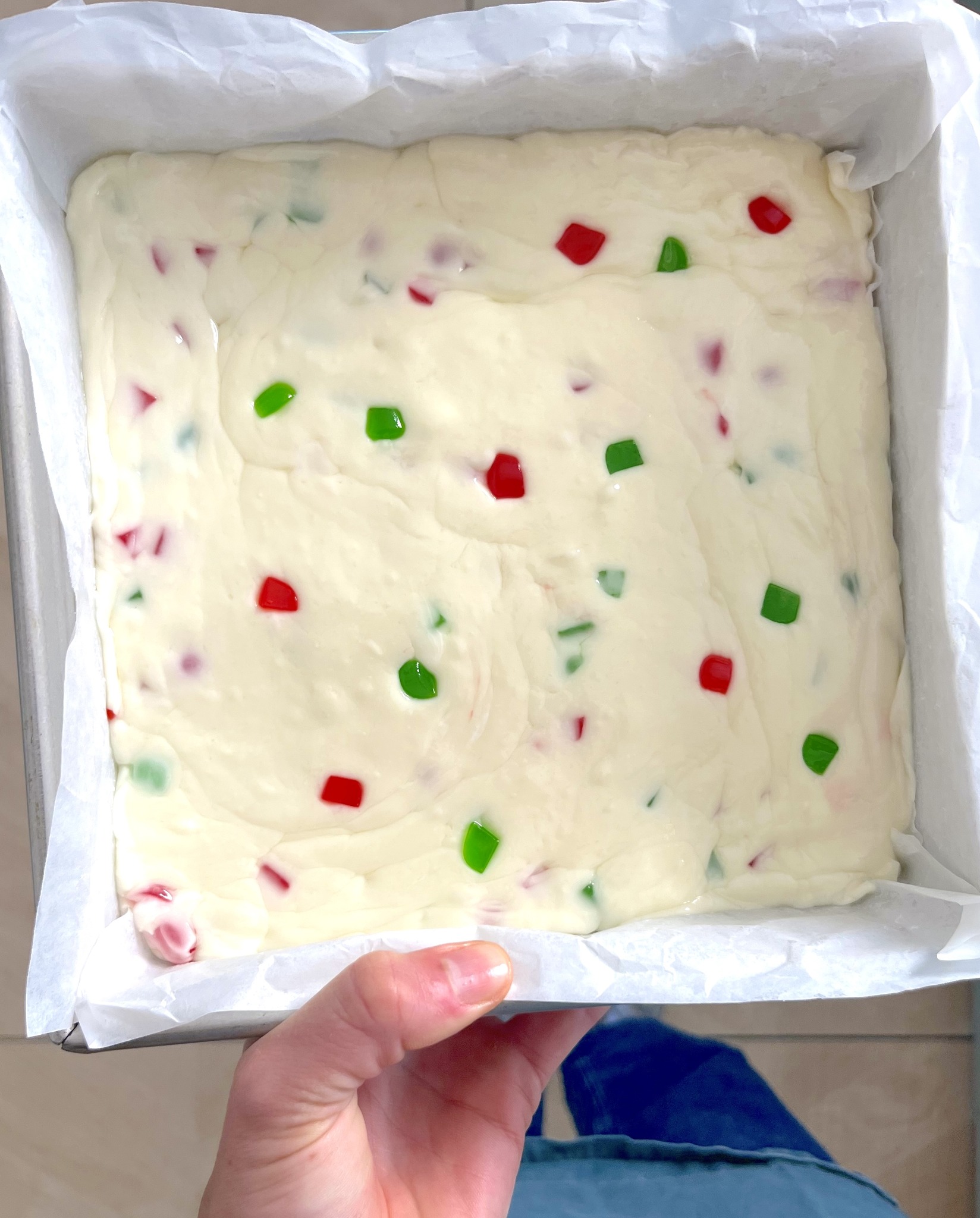 • 1 cup red and green gumdrops or chewy candy, chopped