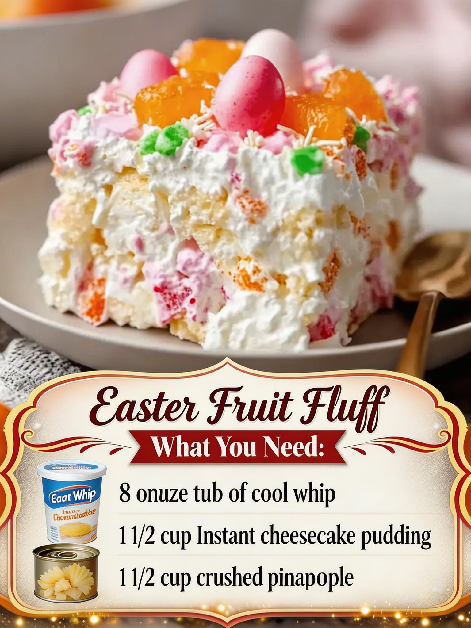 - 8 oz Cool Whip, thawed: The creamy base that gives your Easter Fruit Fluff its signature lightness—think airy clouds with a subtle vanilla kiss.