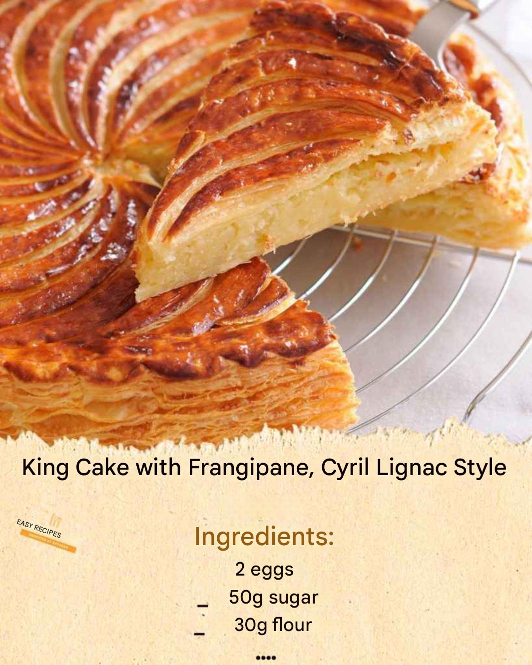 The King Cake with almond cream by Cyril Lignac is made of a crispy, golden puff pastry crust filled with a smooth almond cream made from ground almonds, sugar, eggs, butter, and flavorings such as vanilla and rum. A small ceramic figurine (called a fève) is traditionally hidden inside the cake, and whoever finds it in their slice becomes king or queen for the day. Galette des rois is a much-loved French culinary tradition that has been enjoyed for many years.