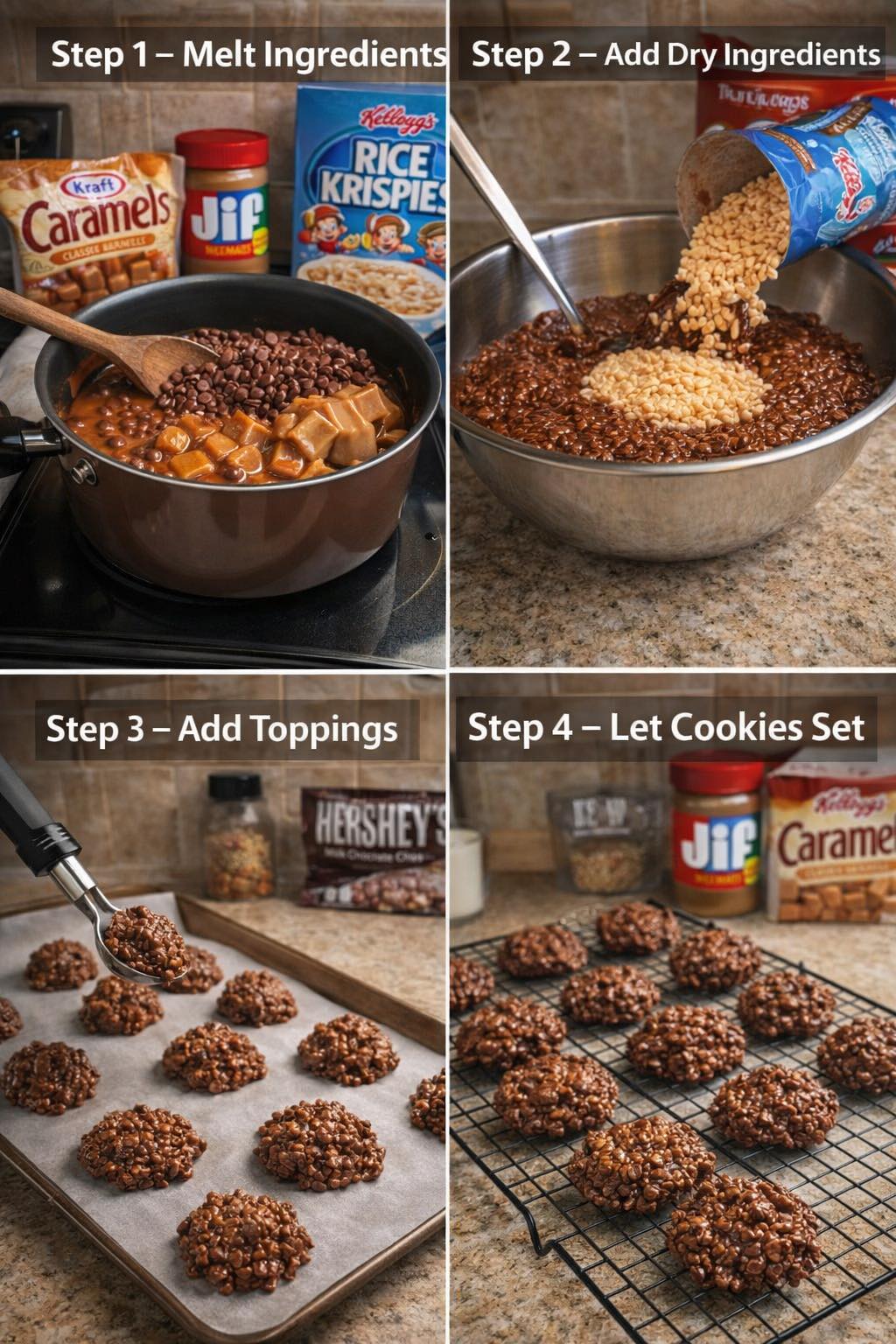 If you need an easy dessert that looks impressive but requires almost no effort, these Chocolate Caramel Crunch Cookies are perfect. No oven, minimal ingredients, and the crunch is unreal.