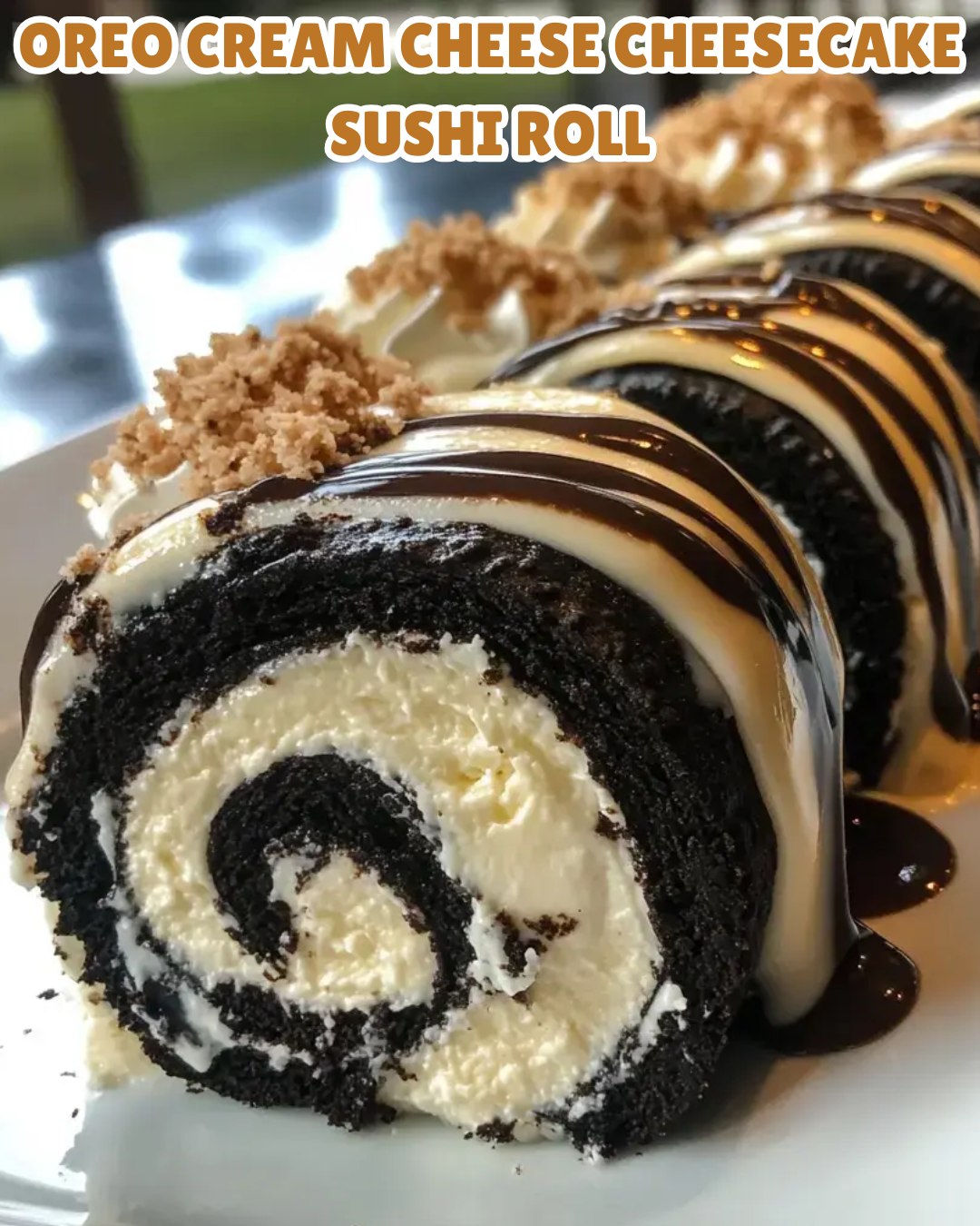 The Oreo Cream Cheese Cheesecake Sushi Roll Dessert is a fun and creative twist on traditional cake rolls. Combining a rich chocolate cake base with a creamy Oreo cream cheese filling, this dessert is finished with white chocolate drizzle, whole Oreo cookies, and extra crushed Oreos for added texture. It’s the perfect treat for Oreo lovers!