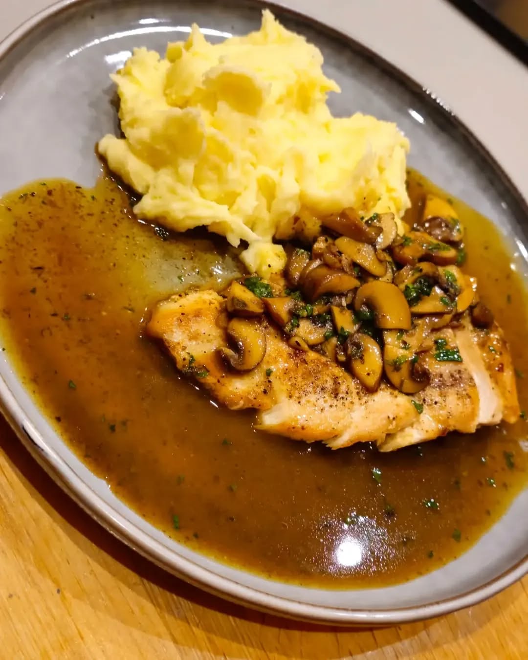Pan-Fried Chicken Breast with Brown Mushroom Sauce, Served with Mashed Potatoes
