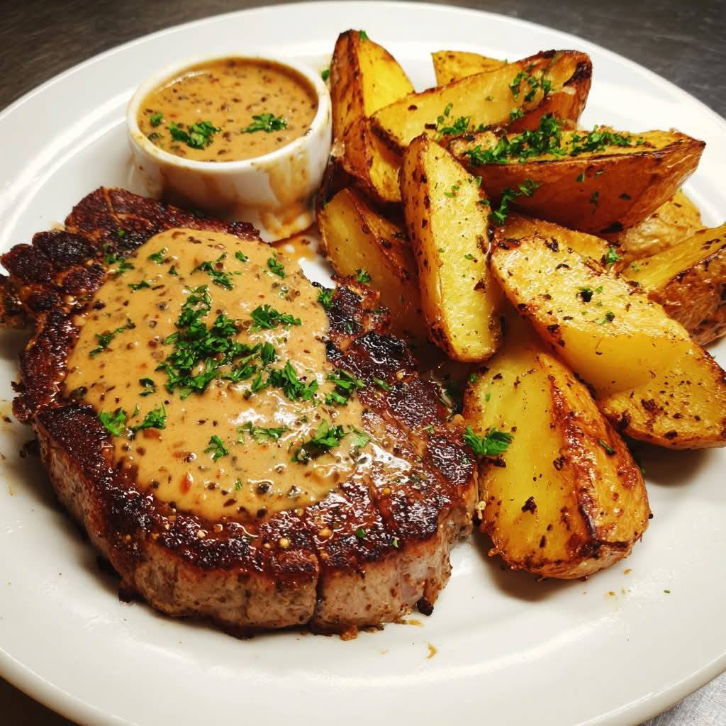 A true classic that never disappoints! Juicy pan-seared steak with creamy pepper sauce and golden-brown potato wedges. The perfect weekend dinner the whole family will love.